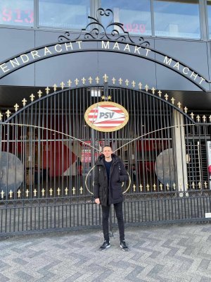 Ifjabb Vitos György az idei holland bajnok, a PSV Eindhoven stadionjánál, Csányi Karina fotóján
