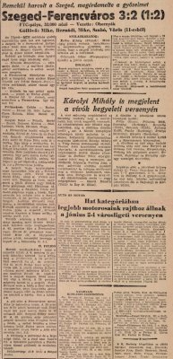 ...majd 1946. június 23-án jött Szegeden egy olyan különleges arányú bravúr, több, mint 5000 helyi drukker óriási örömére, amikor a Szeged a néhány évvel korábbi 5:0-ás (!!) diadala után ezúttal 6:3-ra "verte agyon" a Ferencvárost, a gólokat Nagy Antal (3), Hernádi (2) Vörös ill. Mike (2) és Gyetvai szerezték!