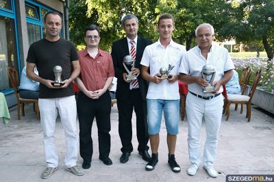 A fotón balról: Tóth János, Pintér M. Lajos Szegedma-főszerkesztő, Nógrádi Tibor megyei fociigazgató, Kiss Roland és Deák Ferenc.