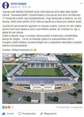 2017.10.26.Mivel a Szeged 2011 Vezetése nem reagálta le a klub leghűségesebb szimpatizánsai által közzétett nyílt levelet, ezért újabb szurkolói véleményeket adunk közre a Facebookról - ezúttal az Ultras Szeged szenzációs bejelentését alapul véve!! Természetesen korábbi hagyományainkat követve folyamatosan leközöljük a sokat csalódott szegedi futballdrukkerek kendőzetlen véleményeit az egyes bajnoki fordulókat követően is...