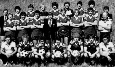 Balról: a mai fejezetünk főszereplője, dr. Kováts Gábor (kezében e sorok írójának 1980-tól minden hazai meccsünkre évtizedeken át kiadott "HAJRÁ SZEOL AK!" c. műsorfüzetével!), valamint Szabó Gyula, Móricz István, Polyvás Tamás, Gerecz Péter, Deák Ferenc, Kozma Zoltán, Kántor Ferenc, Orosházi László és a labdával egyik ex-kapusunk, Újhelyi István látható...