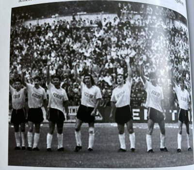 Kun Lajosék (balról a negyedik) üdvözlik a gyakran teltházas, de azóta szégyenszemre ledózerolt futball-szentélyünk, a Felső Tisza-parti stadionunk fanatikus drukkereit...